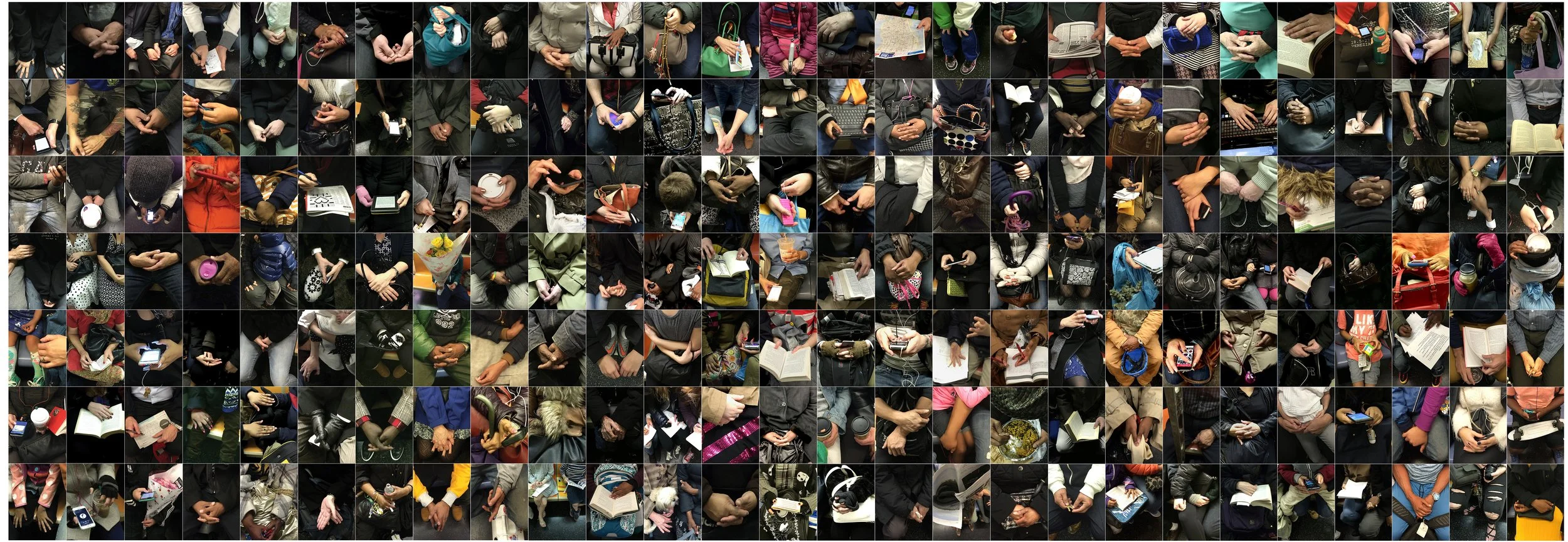 During our rides we slept, kissed, created spead sheets, prayed, stared into space, ate take-out, texted and gamed endlessly, counted prayer beads, used our fingers to do math homework, nodded with our earbuds, stood up for others to sit down, rested our feet on soccer balls, drew in journals, and held — hands, babies, little children, purses, dogs, strollers, skateboards, white canes, apples, coffee, newspapers, saxophones, umbrellas, flowers, Kleenex boxes and phones.